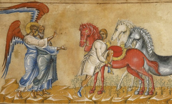 1:8 I saw [Israel’s restoration revealed through the visions given to Zechariah in chapters 1-8] at night [Zechariah received all eight visions in the same night], and behold, a man [the angel of the Lord as per v. 11] was riding on a red horse [“red” associated with war and death], and he was standing among the myrtle trees which were in the ravine, with red, sorrel and white [associated with vengeance and triumph (cf. Rev. 19:11,14)] horses behind him.