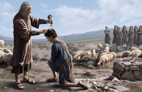 16:13 So Samuel took the horn of oil and anointed [Heb. mashach from which we get our word Messiah] him [oil symbolized anointing with the Holy Spirit] in the presence of his brothers [witnesses], and from that day on the Spirit of the Lord came upon David [first mention of his name in the books of Samuel; name means: “Beloved of the Lord”] in power. Samuel then went to Ramah [and David returned to sheep field].